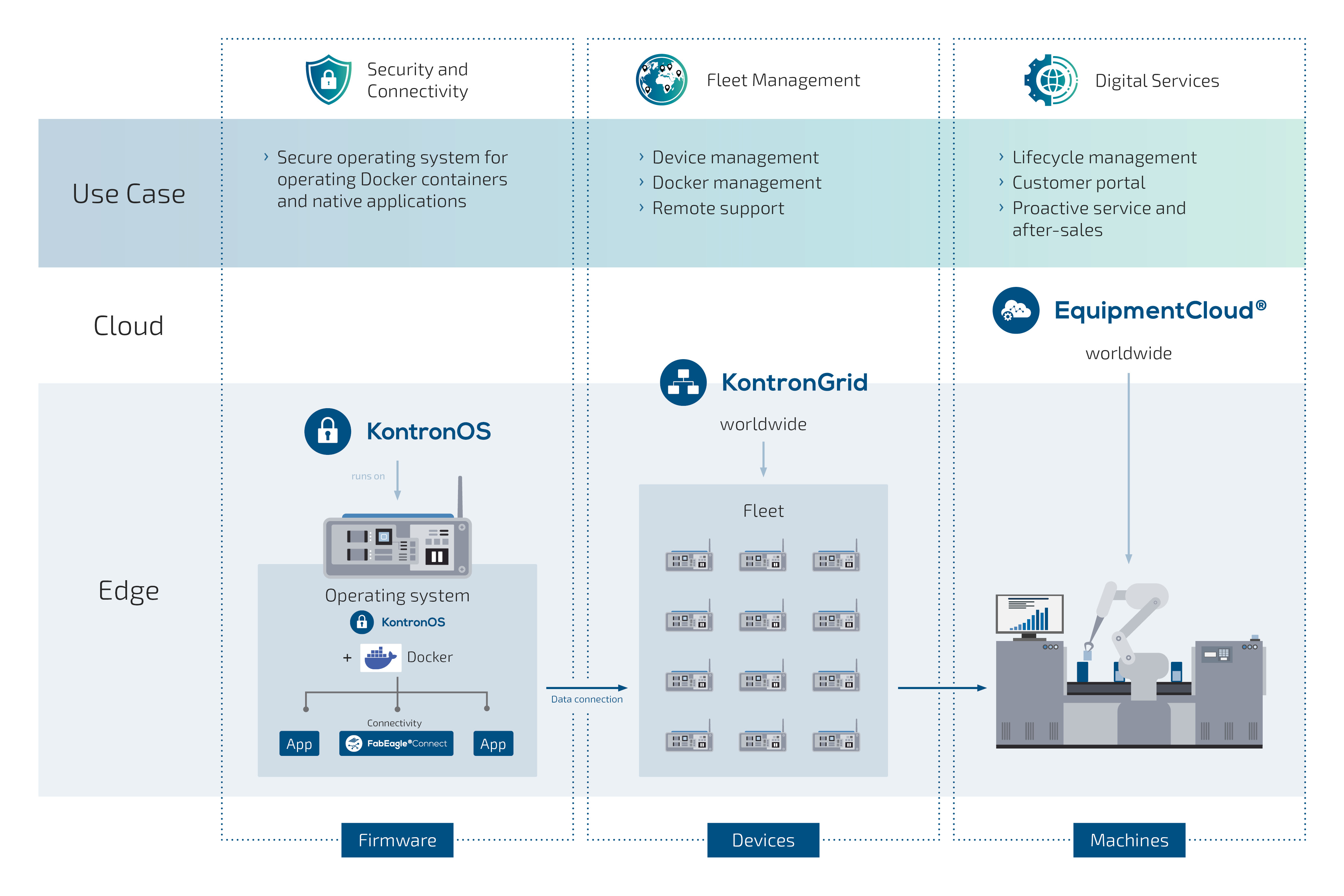 While taking into consideration the overall system, with increasing scaling, EquipmentCloud® focuses in particular on the worldwide management of integrated IoT devices. After all, not every medium-sized equipment manufacturing company has local service branches that can access the devices within a very short time period. That is why remote access and easy monitoring of edge devices are essential. For this reason, KontronGrid functionality has been implemented as an optional module within EquipmentCloud®. The two products therefore complement each other on this level as well.