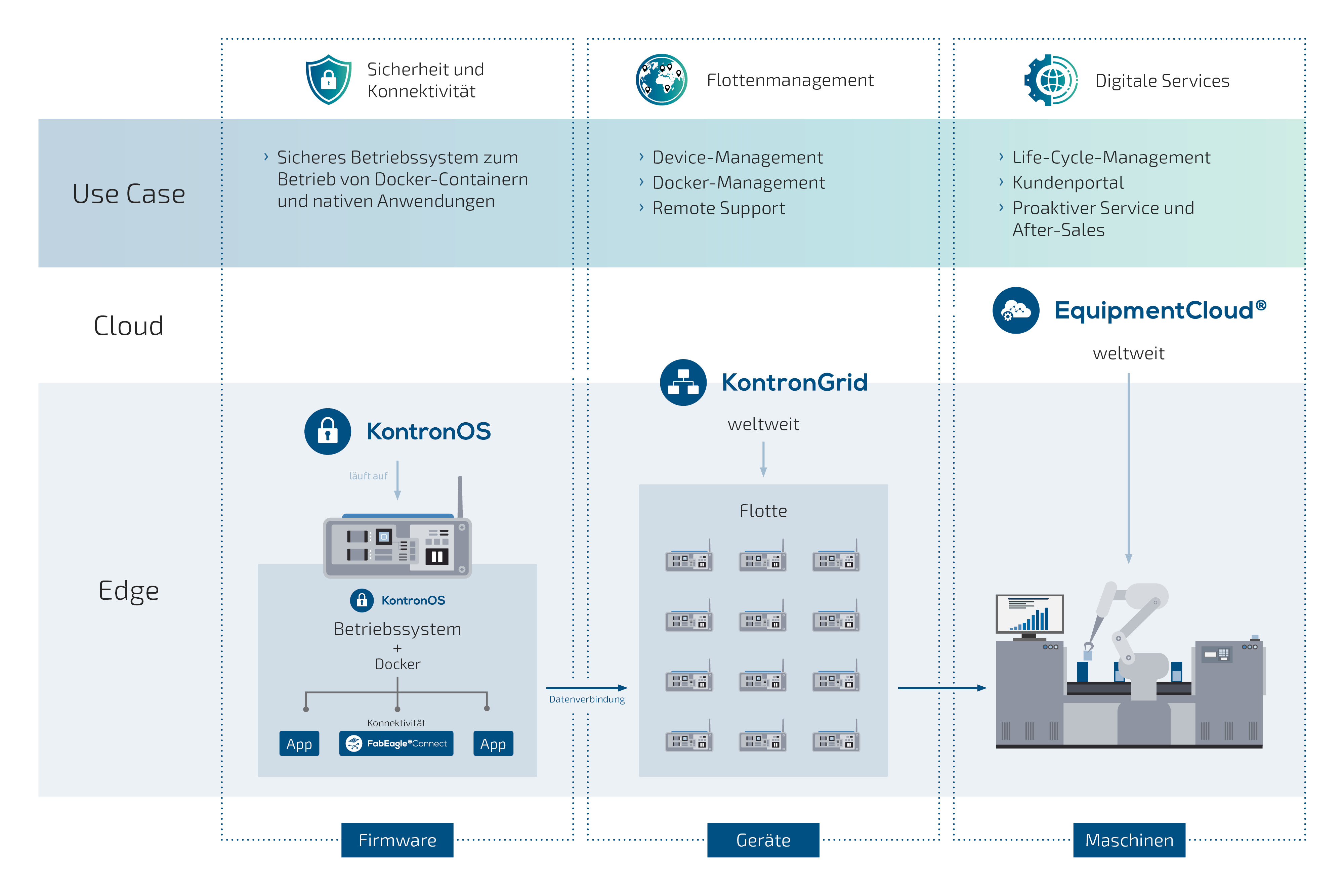 Der Fokus der EquipmentCloud® liegt auf dem Gesamtsystem, wobei mit zunehmender Skalierung das weltweite Management der integrierten IoT-Geräte von besonderer Bedeutung ist. Denn nicht jeder mittelständische Maschinenbauer verfügt über lokale Serviceniederlassungen, die innerhalb kürzester Zeit auf die Geräte zugreifen können. Der Fernzugriff und die einfache Überwachung der Edge-Devices sind daher essentiell. Aus diesem Grund wurde die KontronGrid Funktionalität als optionales Modul innerhalb der EquipmentCloud® realisiert. Somit ergänzen sich die beiden Produkte auch auf dieser Ebene.